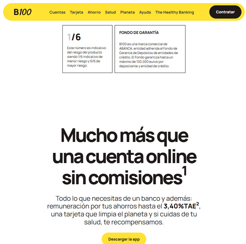 B100 es el banco digital de ABANCA. A fecha de noviembre de 2024, la Cuenta Health ofrece un 3,40 % de rentabilidad. El máximo dinero que se puede remunerar en esta cuenta es de 50.000 euros. Si se invierte esta cantidad, es posible obtener una rentabilidad de 1.700 euros brutos anuales.