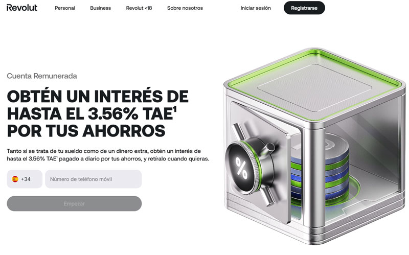 Actualmente, la cuenta remunerada de Revolut ofrece una rentabilidad del 3,56 % TAE y sin necesidad de domiciliar una nómina. La cantidad máxima de dinero que permite rentabilizar es de 100.000 euros, con facilidad de acceso al dinero y sin requisitos extra. De este modo, si un cliente decide invertir dicha cantidad máxima, puede obtener 3.560 euros de beneficio bruto anual.
