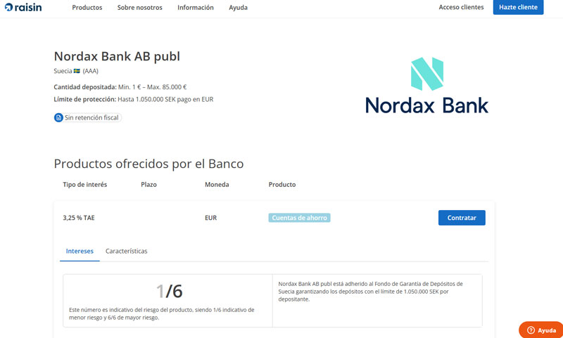 Actualmente, el banco sueco Nordax Bank ofrece una rentabilidad anual de 3,31 %. El máximo de dinero que se puede depositar es de 85.000 euros. Al invertir esta cantidad, es posible obtener una rentabilidad bruta anual de 2.813,50 euros.