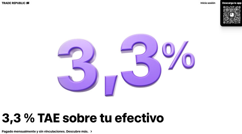 El banco Trade Republic ofrece exactamente una rentabilidad del 3,3 % a fecha de noviembre de 2024. La cantidad máxima de dinero que permite rentabilizar son 50.000 euros, de modo que es posible obtener 1.650 euros brutos al año.