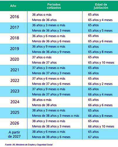 Desde el año 2013 la edad de jubilación empieza a retrasarte a razón de un mes al año hasta el 2018. A partir de entonces, se retrasa dos meses al año hasta alcanzar los 67 en el 2027. Además, los años cotizados también van en aumento desde los 35 hasta los 38 y medio en 2027 a razón de un trimestre al año.