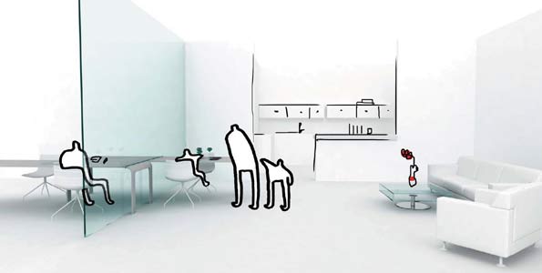 Partimos de la utilización de las superficies interactivas como medio de trabajo y ocio. Una pared móvil de vidrio transparente que se vuelve opaco según la necesidad y sobre el cual se puede proyectar. Es una superficie vertical que se utilizará para trabajar, jugar, en una o ambas caras simultáneamente. Este tabique contiene dos mesas que se deslizan juntas o por separado a ambos lados de la superficie de vidrio creando distintas combinaciones según las necesidades de la actividad a desarrollar”, explican los jóvenes diseñadores que han participado en este proyecto.