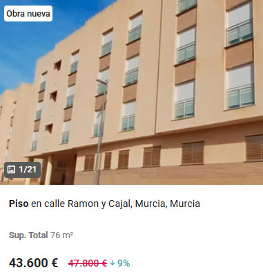 En Murcia se vende este otro piso por 43.600 euros. La vivienda está para estrenar y tiene una superficie de 76 m² totales construidos. La distribución consta de una habitación, un baño, cocina, salón-comedor y plaza de garaje como anejo.