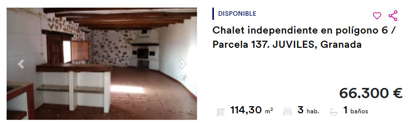 En Juviles (Granada) se vende este chalet independiente por 66.300 euros. La vivienda tiene una superficie total construida de 114,30 metros cuadrados y una superficie útil de unos 114,30 m². El chalet tiene dos plantas con las siguientes estancias: planta baja con salón y cocina integrada y baño; y planta alta con tres dormitorios.