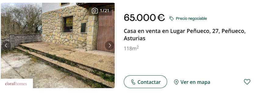 Por 65.000 euros se vende esta casa de pueblo en Peñueco (Asturias). La vivienda cuenta con una superficie total construida de 118 metros cuadrados, distribuidos en salón-comedor, cocina amueblada, dos habitaciones y un baño.