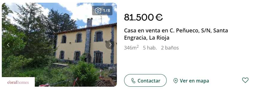 En Santa Engracia (La Rioja) se vende esta vivienda por 81.500 euros. La casa tiene una superficie total construida de 346 m², distribuidos en dos plantas. La planta baja consta de cocina, salón-comedor, habitación, baño y hall. La segunda planta consta de sala-estar, cuatro habitaciones, baño y dos terrazas.