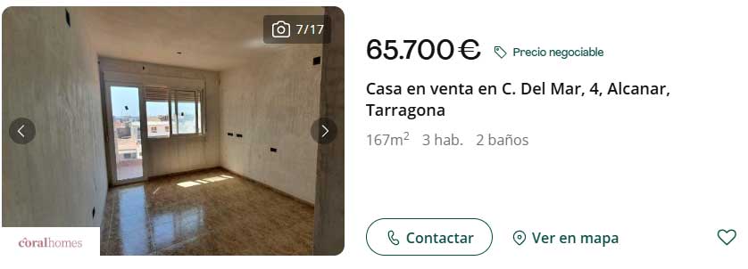 En Alcanar (Tarragona) se vende esta casa por 65.700 euros. La vivienda dispone de una superficie total construida de 167 metros cuadrados, distribuidos en las siguientes estancias: tres dormitorios, dos baños, salón-comedor, cocina y terraza.