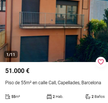 En Capellades (Barcelona) se vende este piso de banco por 51.000 euros. El inmueble tiene 55 metros cuadrados de superficie total construida, distribuidos en cocina abierta al salón-comedor, dos dormitorios y dos baños. El interior de todas las estancias se encuentra en muy buen estado de conservación y están aptas para entrar a vivir desde ya mismo.