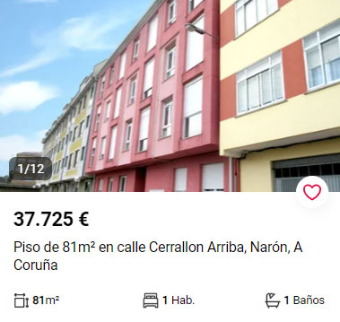 En Narón (A Coruña) se vende este piso de protección oficial por 37.725 euros. El inmueble cuenta con una superficie total construida de 81 metros cuadrados, distribuidos una habitación, un cuarto de baño, cocina y salón-comedor. La principales playas de la zona se encuentran a tan solo 20 minutos en coche.