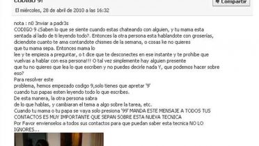 El Código 9 es realmente simple: indica a los menores que para “camuflar” sus actividades mientras utilizan cualquiera de las herramientas de comunicación, mencionen o escriban 9, para que así la persona con la que están conversando sepa que hay alguien mayor vigilando y cambie rápidamente de tema o borre la información intercambiada.