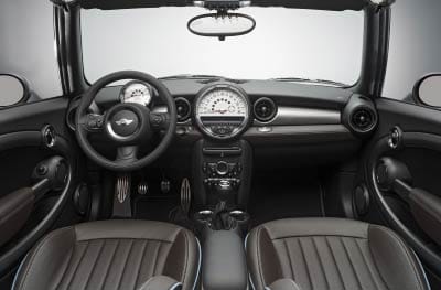 Los pedales de acero inoxidable, el revestimiento interior (listón decorativo y anillos de forma elíptica de la puerta) de acabado Suntouched Brushed Alloy, la línea cromada interior y las alfombrillas de velours con bordes de color Dark Truffle, completan la lograda estética del habitáculo del Mini Cabrio Highgate.