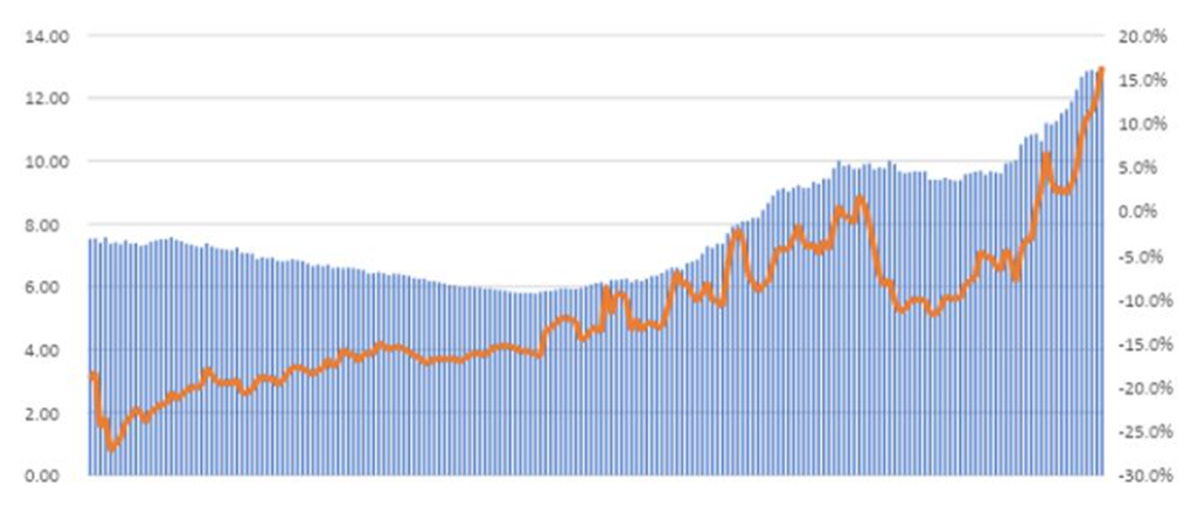El precio medio y tendencia general del alquiler en España va en la misma línea que en el caso concreto de Canarias. La línea naranja muestra la clara tendencia alcista de los precios en sintonía con las barras azules, que muestran el caso específico de la comunidad canaria. Aunque la tendencia media muestra un coste menor que el caso autonómico.