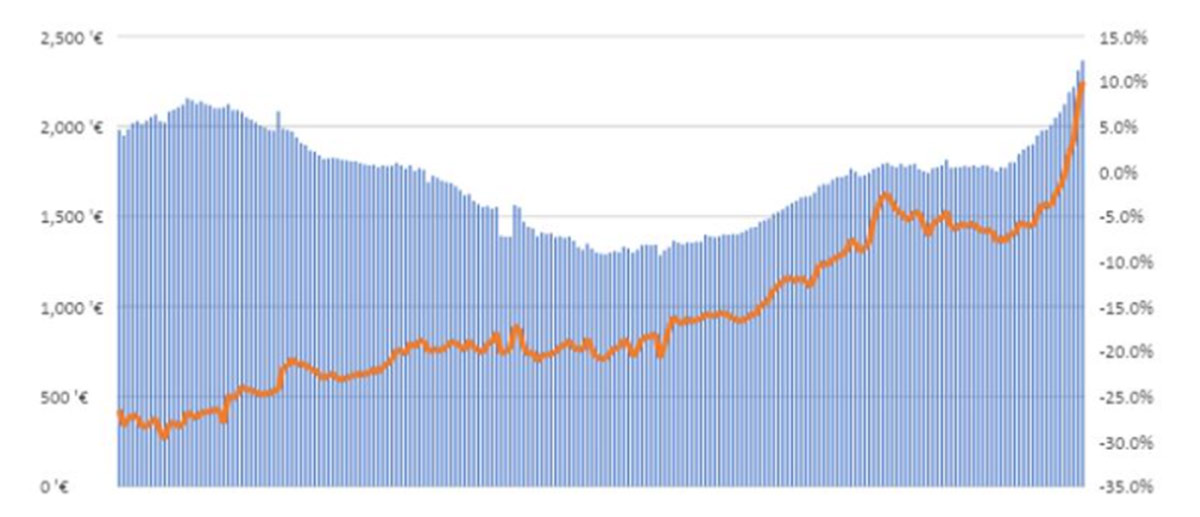 El siguiente gráfico muestra la evolución del precio de la vivienda tanto en España, como en las islas Canarias. La línea naranja hace referencia a la media del país, que muestra claramente una tendencia alcista en el último año y medio.
