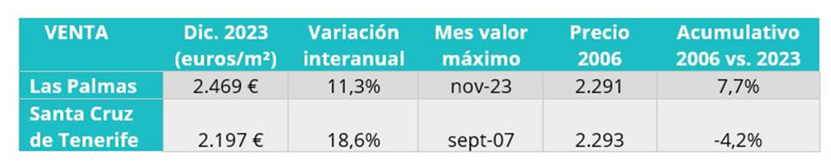 Los datos son alarmantes si se comparan con el contexto de la burbuja inmobiliaria: El precio de la vivienda de segunda mano en Canarias se encuentra un 15 % por encima del registrado durante esta época de crisis inmobiliaria de 2007. Actualmente, se encuentra en los 2.421 euros el metro cuadrado y entonces se registró un precio medio de 2.101 euros el metro cuadrado.