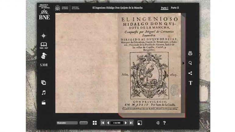 La Biblioteca Nacional de España acaba de presentar su último gran proyecto: la digitalización de la primera edición de El Quijote, que permite a cualquier amante de la lectura disfrutar de la obra cumbre de Cervantes casi como si tuviera el libro original en sus manos a través de Internet. Es posible ojear 1.282 páginas y leer la obra tanto en castellano antiguo como en su trascripción moderna, pero no sólo eso. Junto al texto, se ha creado todo un mundo multimedia que ayuda a entender la obra y su contexto histórico: Mapas, ilustraciones, grabados, música de la época, información sobre libros de caballerías…