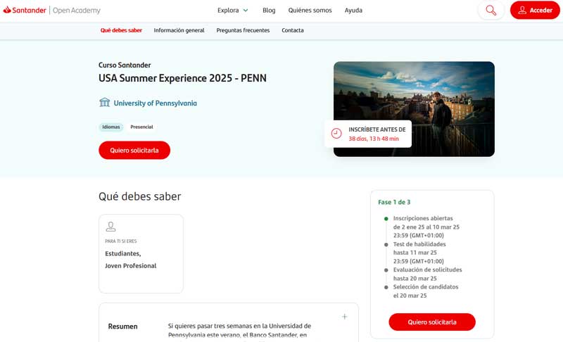 El ‘Curso Santander USA Summer Experience – Penn’ es un programa presencial de tres semanas, del 14 de julio al 1 de agosto de 2025, que se llevará a cabo en el campus de la Universidad de Pennsylvania. Los participantes asistirán a clases de inglés y participarán en actividades diseñadas para reforzar competencias como liderazgo, trabajo en equipo, comunicación persuasiva, manejo de redes sociales y psicología positiva.