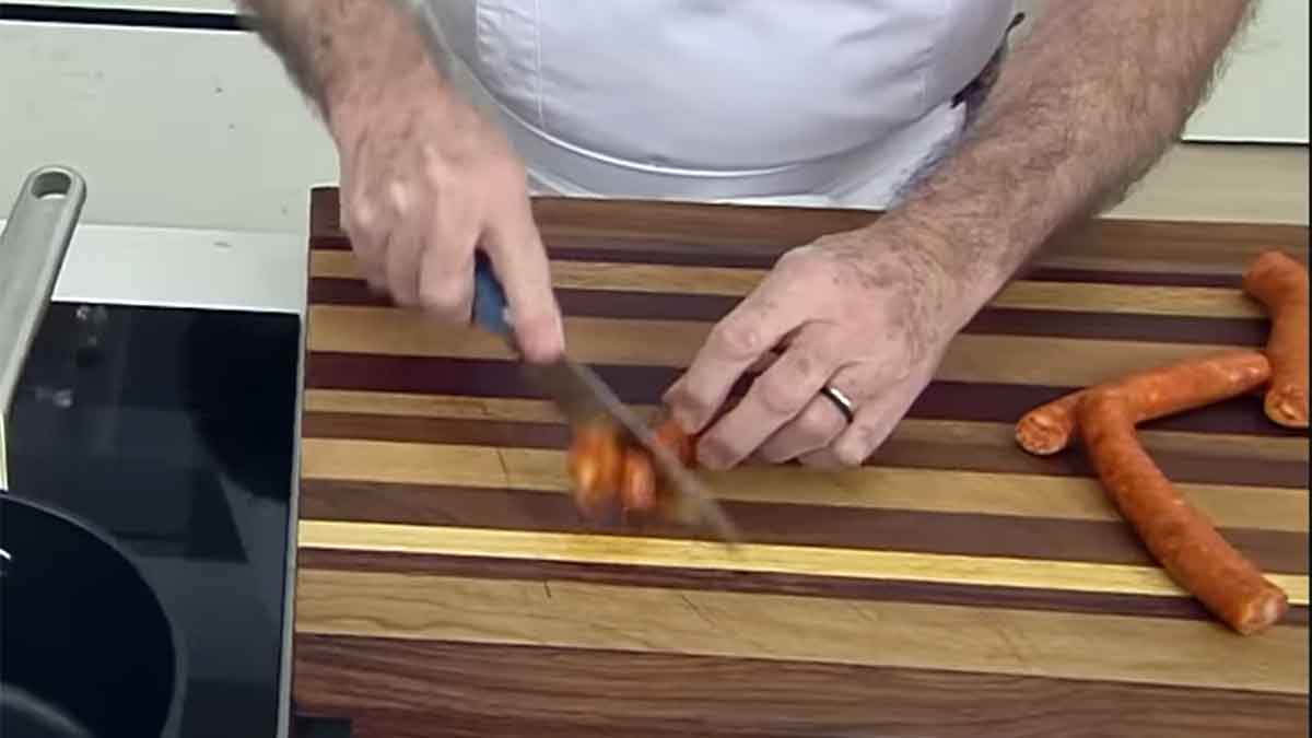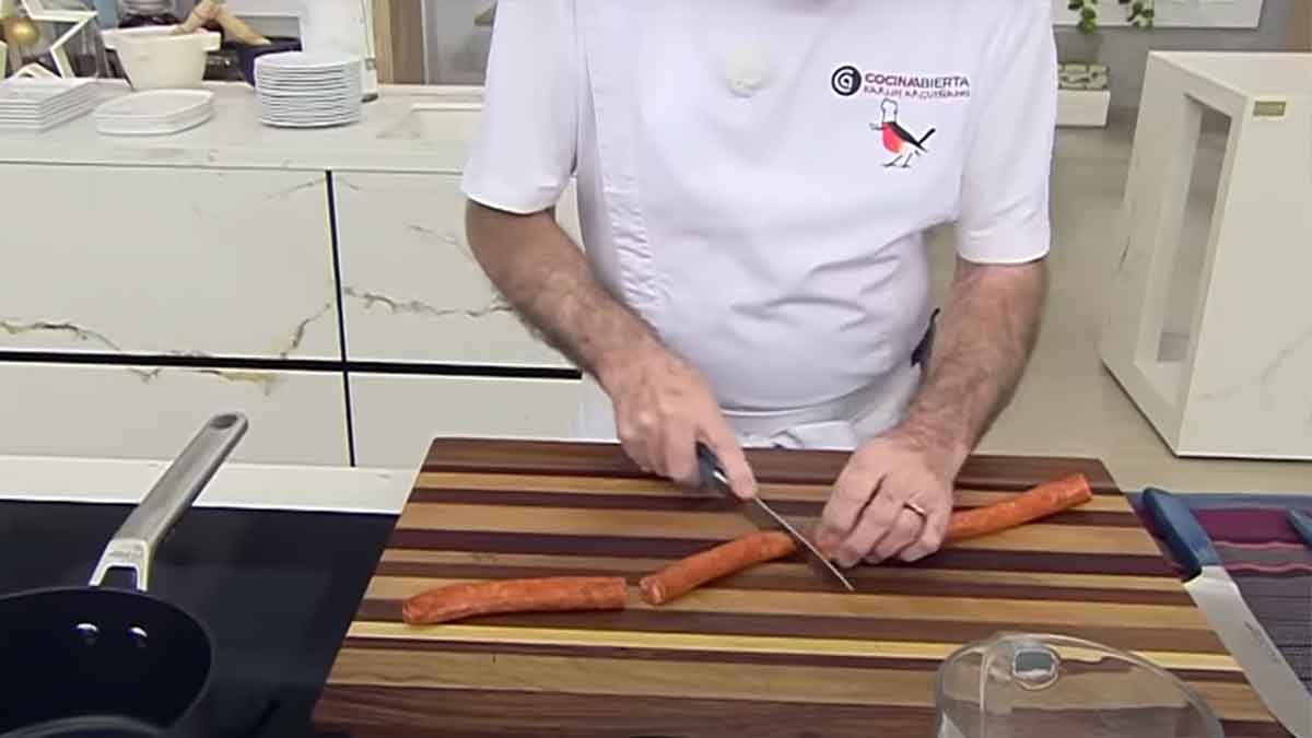 - Lo que hay que hacer después, una vez esté bien pelada la chistorra, es rehogar y sofreír el relleno de la chistorra. Para que el sofrito quede en su punto, el truco está en picar la chistorra una vez retirada la piel. Solamente hay que hacer algunos cortes con el cuchillo y, como la textura es similar a la del picadillo, quedará prácticamente desmenuzada y lista para meter a la sartén. Hay que hacer primero un poco la chistorra en la sartén para quitarle parte de la grasa.