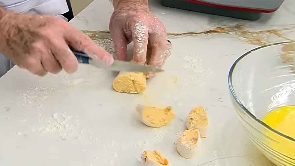 - Para evitar hacer croquetas de una en una, hace rollos de la masa, como si fuera un chorizo. Le da la forma y, cuando tiene la masa en forma de churro, hace cortes pequeños. Con estos trozos, coge con las manos y les da forma de una en una.