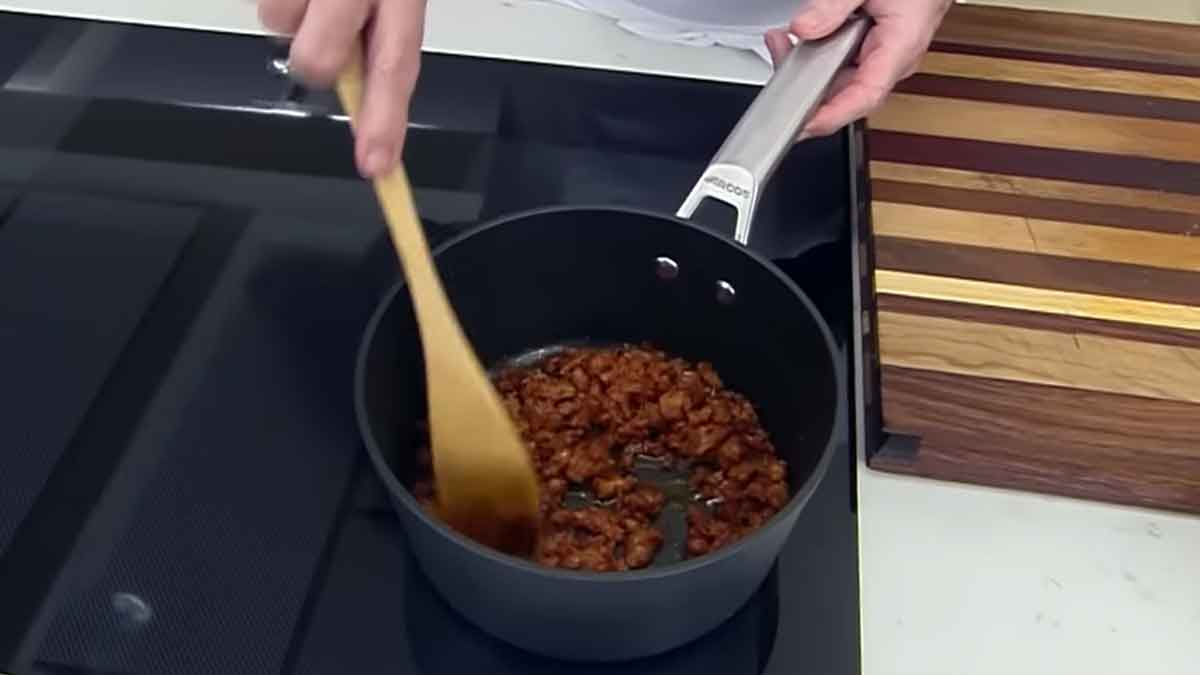 - Si en la sartén se ha quedado mucha grasa que ha soltado la chistorra, lo ideal es quitarle el sobrante con un colador para que la croqueta no quede excesivamente grasienta ni pesada. Pero en el caso de la receta que prepara Arguiñano, no ha soltado mucha grasa y, por tanto, decide dejar esa poca cantidad que ha soltado la chistorra para incluirla en la masa de las croquetas.