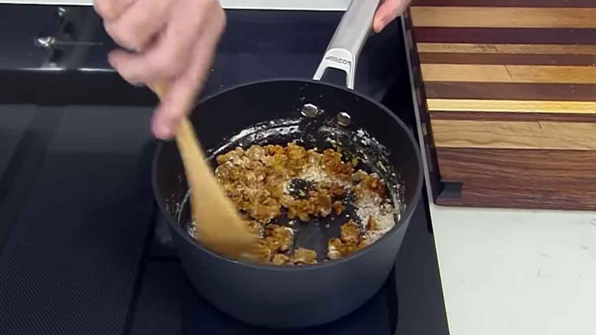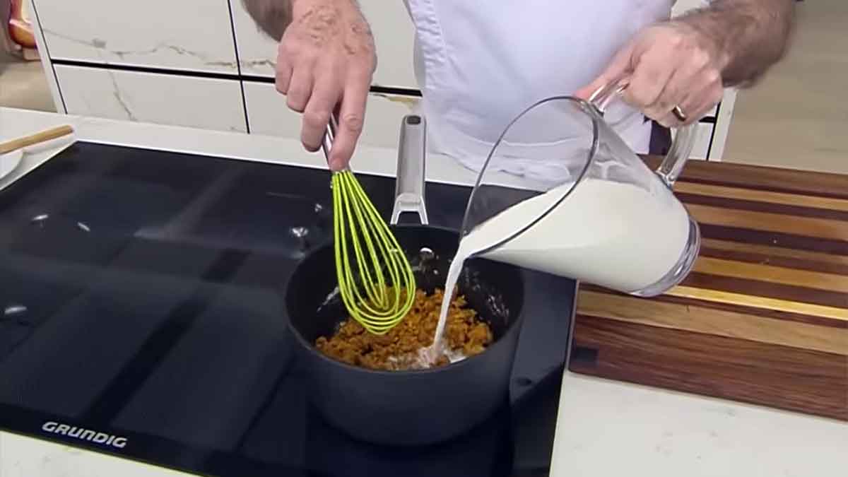 - Lo siguiente que hay que hacer es cambiar la espátula de madera por una varilla de batir los huevos. Porque el siguiente paso en el cocinado consiste en echar de forma progresiva la leche a la mezcla de harina y chistorra para crear la masa. Echa un chorro de leche y empieza a remover la mezcla con las varillas. No hay que dejar de mover el contenido de la sartén para garantizar que la mezcla de la masa salga uniforme y homogénea.