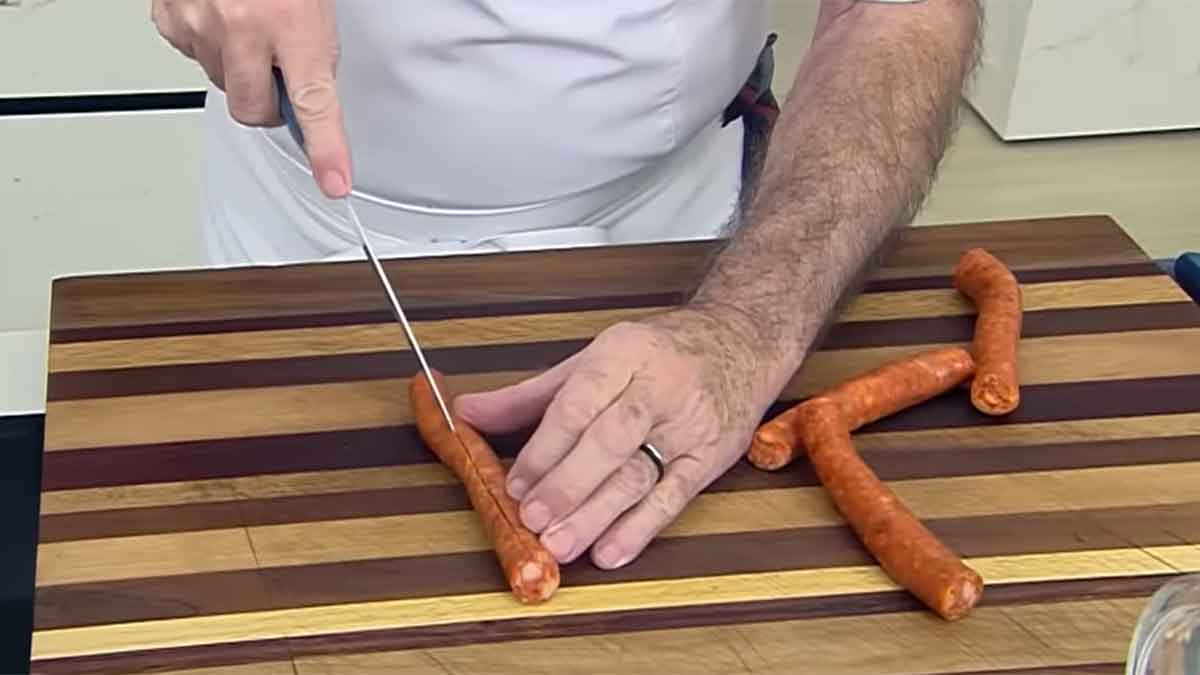 - El primer paso de esta elaboración de croquetas caseras de chistorra pasa por quitarle la piel a este ingrediente principal. Con un cuchillo, hace varios cortes y deja un total de cuatro trozos aproximadamente del mismo tamaño.