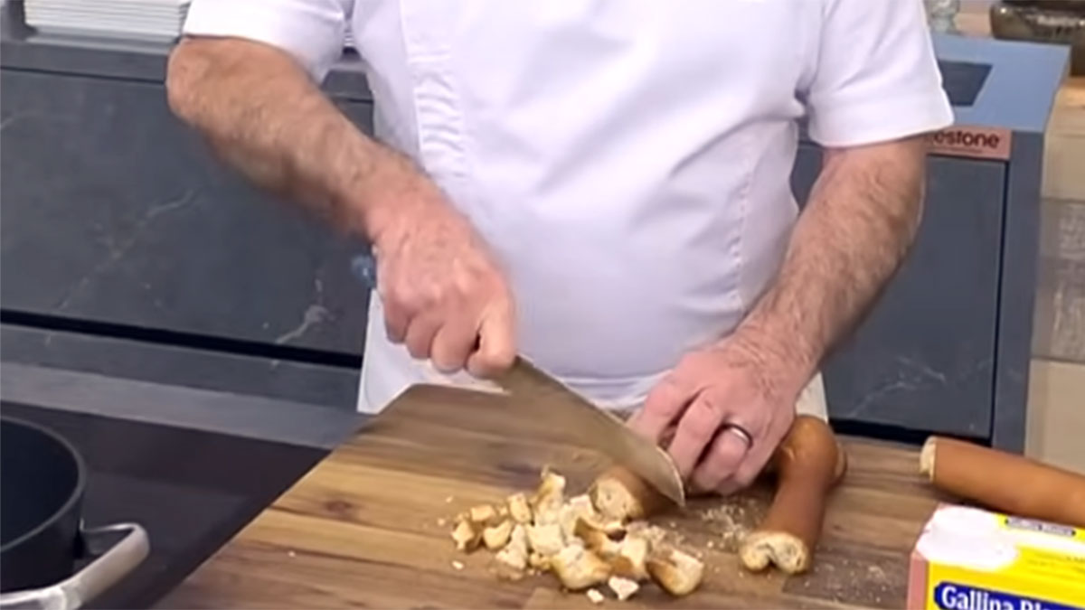- Después, hay que coger el pan y empezar a cortarlo. Con un cuchillo, hay que hacer cortes para obtener trozos pequeños de pan. Es normal que en este punto la barra empiece a desmigarse porque es pan duro. Se obtienen trozos irregulares y hasta una gran cantidad de miga sobrante que se cae al cortar. Del pan, para esta receta, sirve todo.
