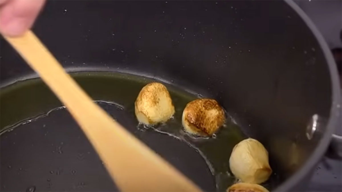 - El fuego tiene que estar a un nivel medio suave para que no se quemen los ajos, porque solamente hay que dorarlos y que se queden pochados. El objetivo es que den sabor a la sopa y que adquieran un tono ligeramente dorado y marrón.