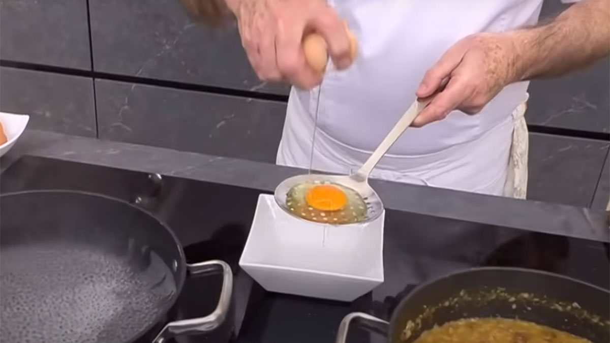 Y un pequeño truco para que salgan perfectos: Casca el huevo y lo echa encima de este utensilio de cocina (fuera de la olla, en cualquier recipiente aparte). De tal manera, según explica el cocinero, que el liquidillo que sobre de la clara se quedará abajo y pondrá el huevo en el agua. “Así conseguimos que el huevo salga redondito”, apunta Arguiñano.
