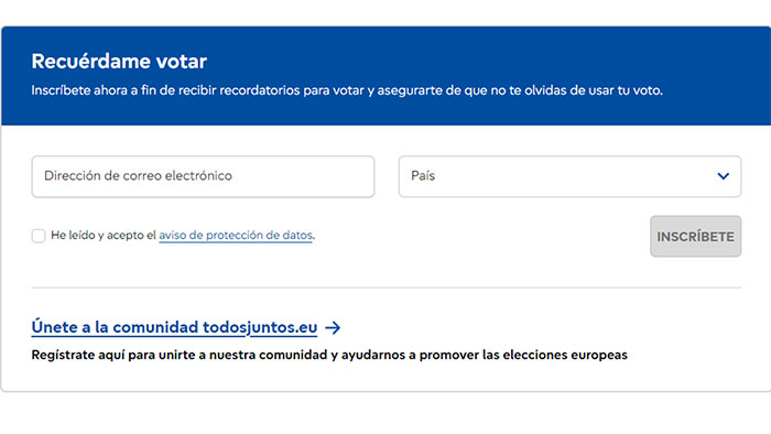 Si quieres establecer un recordatorio para cuando llegue la fecha de votación, puedes hacerlo acudiendo a la web de la Unión Europea. Solo tienes que introducir tu dirección de correo electrónico, el país en el que vas a votar y aceptar el aviso de protección de datos. De este modo, unos días antes de que se abran las urnas, recibirás un correo electrónico a modo de recordatorio.