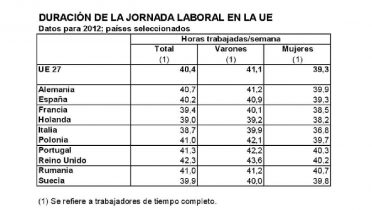 La duración de la jornada laboral media en el conjunto de la UE para un trabajador de jornada completa fue en 2012 de 40,4 horas por semana. En España, la misma fue algo menor, con 40,2 horas semanales. La jornada laboral más prolongada entre los países analizados correspondió al Reino Unido, con 42,3 horas, seguida de la de Portugal, con 41,3 horas.