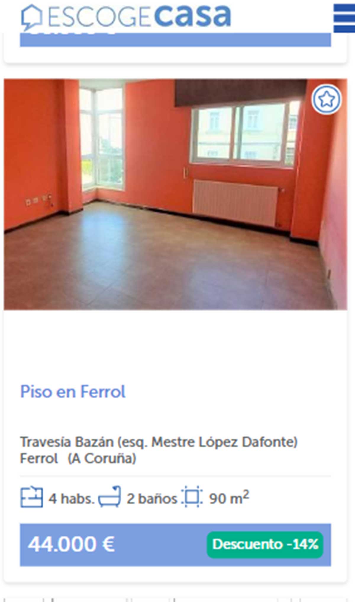 Piso en venta por 44.000 euros en Ferrol, A Coruña. Es una vivienda de cuatro habitaciones y dos baños en 90 metros cuadrados.