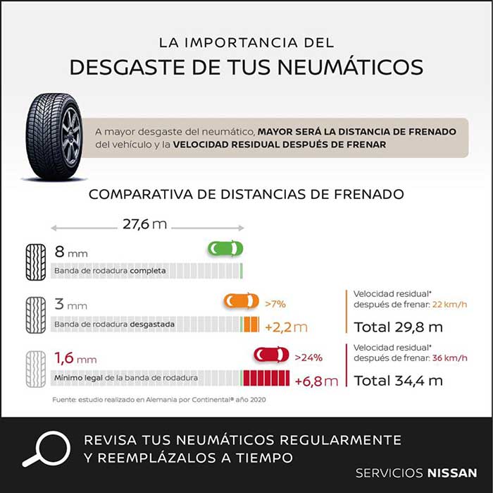 Según Patricia Rocha, directora de Postventa de Nissan Iberia, cada vez que un conductor sale a la carretera para hacer un desplazamiento de media o larga distancia debería comprobar el nivel de presión de los neumáticos, así como su estado de desgaste. En España, uno de cada cinco vehículos que circula por las carreteras tiene una profundidad en la banda de rodadura por debajo de los 3 mm, momento en el que se recomienda cambiar de neumáticos.