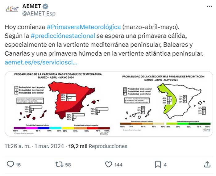 Entre los meses de marzo y mayo de 2024, la probabilidad de que la temperatura media sea cálida aumenta, especialmente en la zona sur y litoral del Mediterráneo, Baleares y Canarias. Es decir, según la AEMET, se espera una primavera cálida en las zonas mencionadas anteriormente, mientras que en la vertiente atlántica se dará una primavera húmeda.