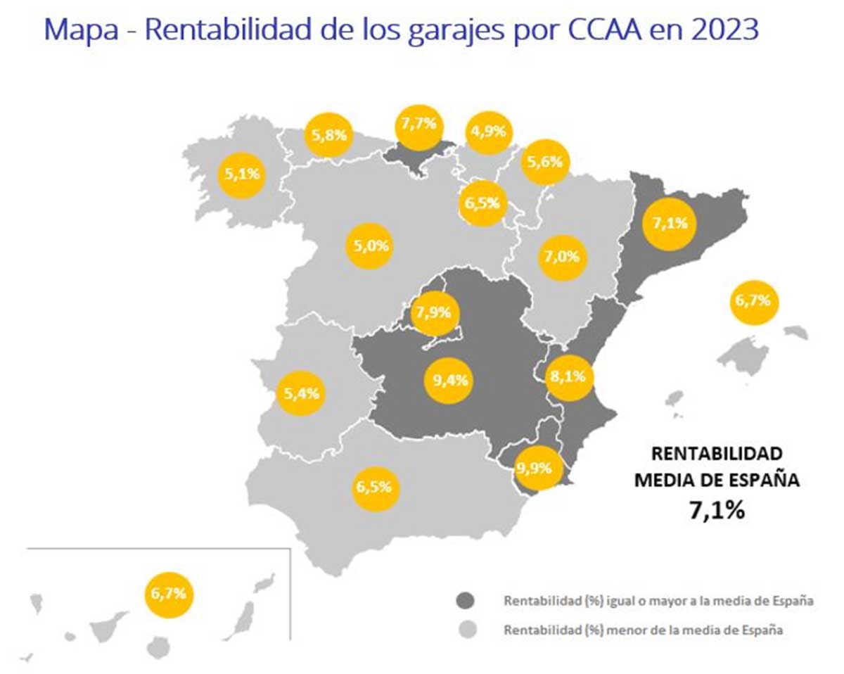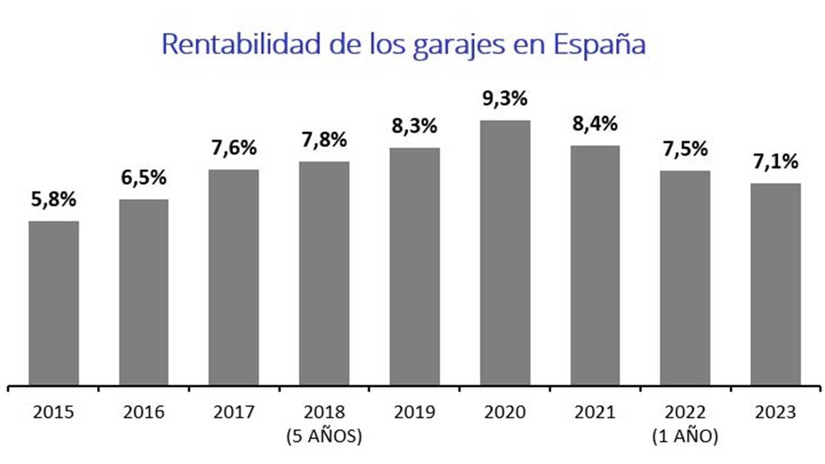 La rentabilidad de los garajes en España se sitúa en un 7,1 % en 2023, lo que supone medio punto porcentual menos que hace solo un año y casi un punto entero menos que hace un lustro. Los datos de Fotocasa evidencian esta tendencia decreciente de la rentabilidad de estas plazas de garaje de manera generalizada en toda España, aunque con excepciones. Esto se debe a que en tres comunidades autónomas la rentabilidad se sitúa por encima de la media y la supera, en el mejor de los casos, en casi 3 puntos enteros.