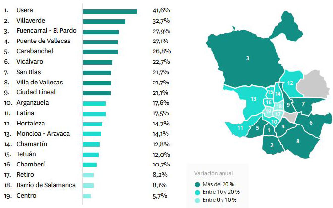 En lo referente a la variación anual del precio de la vivienda en alquiler, se puede observar al concluir el año 2024 que en 19 de los 20 distritos de la capital se incrementa el precio anual del alquiler. El distrito que más sube el precio es Usera, que incrementa un 41,6 %, seguido de Villaverde (32,7 %), Fuencarral – El Pardo (27,9 %), Puente de Vallecas (27,1 %), Carabanchel (26,8 %), Vicálvaro (22,7 %), San Blas (21,7 %), Villa de Vallecas (21,7 %), Ciudad Lineal (21,1 %), Arganzuela (17,6 %), Latina (17,5 %), Hortaleza (14,7 %), Moncloa – Aravaca (14,1 %), Chamartín (12,8 %), Tetuán (12,0 %), Chamberí (10,7 %), Retiro (8,2 %), Barrio de Salamanca (8,1 %) y Centro (5,7 %).