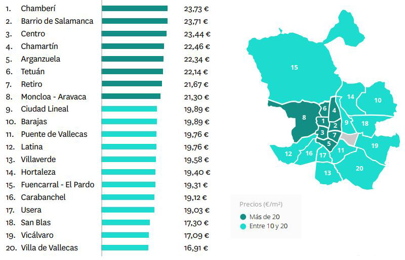 En cuanto a los precios, el distrito de Chamberí se coloca por primera vez como el distrito más caro en los 13 años de análisis. Así, el precio medio de la vivienda en alquiler del distrito de Chamberí es de 23,73 euros/m² al mes, convirtiéndose en el distrito más caro para alquilar una vivienda en toda España. Le siguen: Barrio de Salamanca con 23,71 euros/m² al mes, Centro con 23,44 euros/m² al mes, Chamartín con 22,46 euros/m² al mes, Arganzuela con 22,34 euros/m² al mes, Tetuán con 22,14 euros/m² al mes, Retiro con 21,67 euros/m² al mes y Moncloa – Aravaca con 21,30 euros/m² al mes, entre otros.