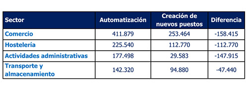 Estas son las áreas que experimentarán una mayor destrucción de puestos de trabajo a consecuencia de la adopción de inteligencia artificial. En cifras, estiman una reducción de ocupación de 158.415 y 147.915 puestos de trabajo, respectivamente, seguidos de la hostelería y la logística.