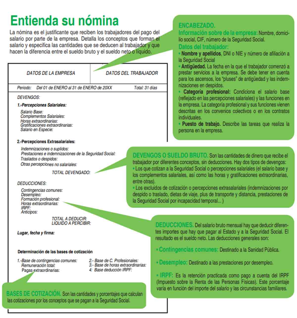 En este documento aparecen todos los conceptos que forman el salario y se especifica las cantidades que se deducen al trabajador y que hacen la diferencia entre el sueldo bruto y el sueldo neto o líquido. ¿Qué son las cuotas de IRPF, de formación, de desempleo o de la seguridad social? ¿A qué se destinan estos euros que me descuentan de mi trabajo? Hemos consultado a los técnicos de la Seguridad Social, que nos explican todos los conceptos de nómina a través de los funcionarios.