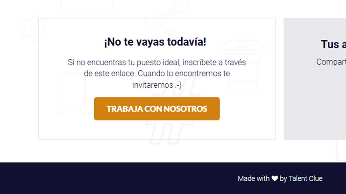 Para subir el CV al portal de empleo tienes que acceder a la web y desplazarte con el ratón hasta el final de la página, hasta que veas un cuadro que dice ‘¡No te vayas todavía!’, como el de la siguiente imagen: