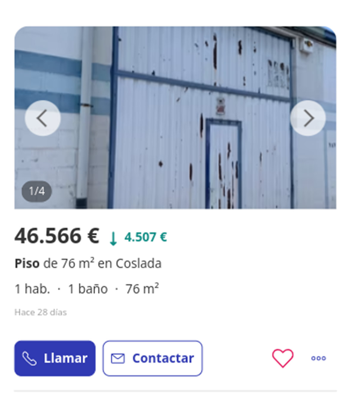 Por 46.566 euros destaca un piso en Coslada. Es una vivienda de una habitación y un baño distribuidos en 76 metros cuadrados.