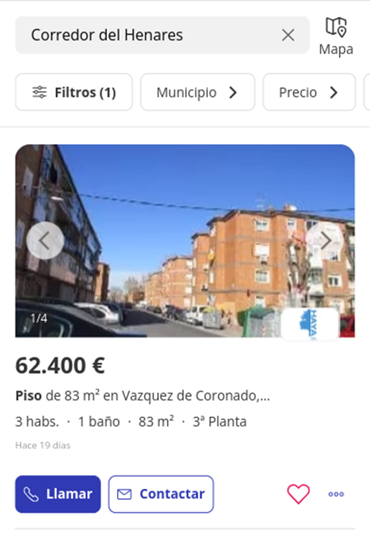 1.857 pisos a partir de 46.200 euros. Este es el catálogo de viviendas disponibles y ubicadas cerca de Madrid que tiene el portal inmobiliario Fotocasa. Todos los inmuebles se encuentran distribuidos por las diferentes localidades del Corredor del Henares: Coslada, Torrejón de Ardoz, Alcalá de Henares, Camarma de Esteruelas o Valdeavero, entre otros.