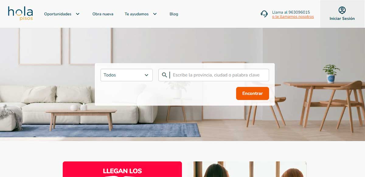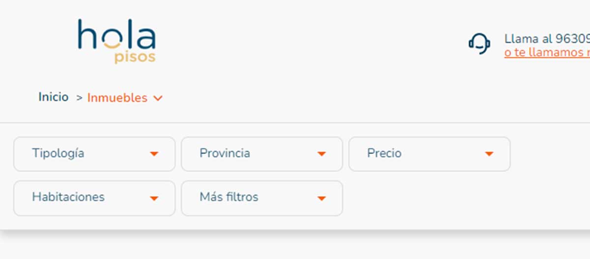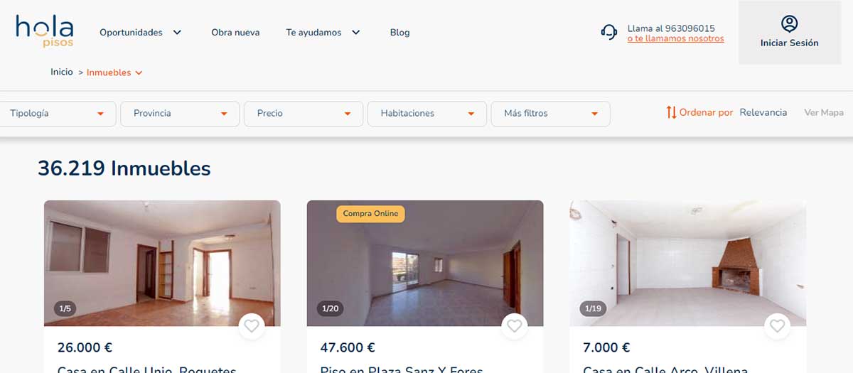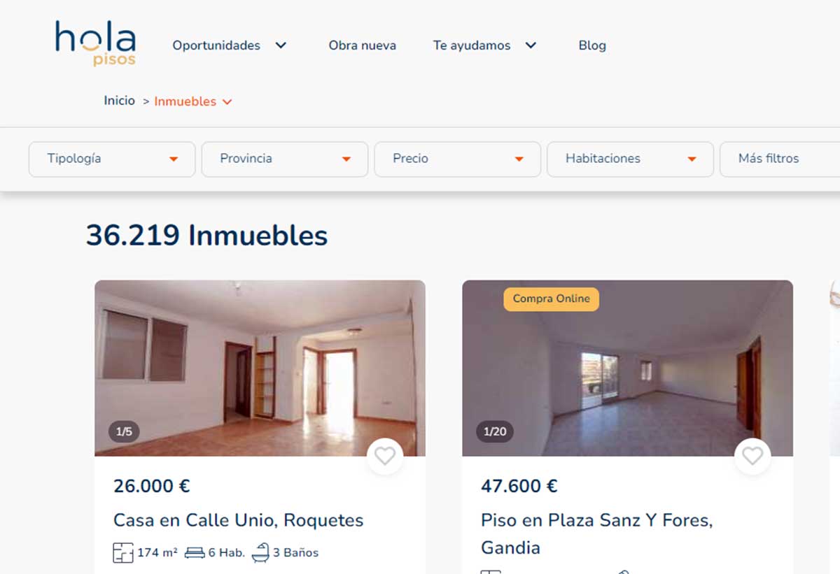 Una vez accedes al catálogo completo de inmuebles disponibles en Holapisos, aparece una imagen como la que puedes ver a continuación.