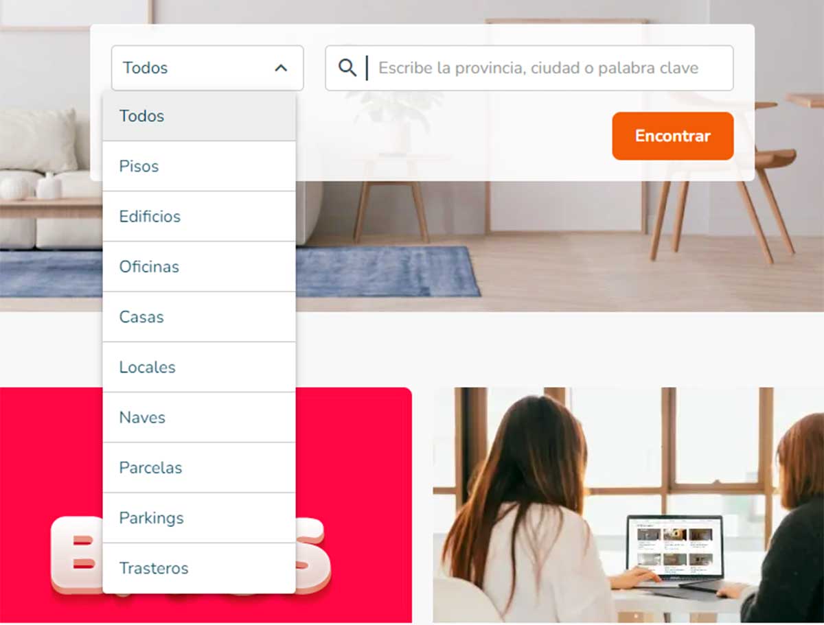 Esta es una herramienta que permite iniciar la búsqueda de viviendas y otros inmuebles disponibles en el portal. Para ello, al pulsar la pestaña que dice ‘Todos’ que se encuentra en la parte izquierda del buscador, se despliega una selección de diferentes opciones, tal y como puedes ver en la siguiente imagen.