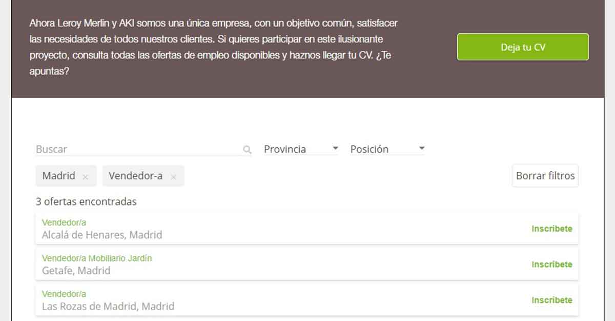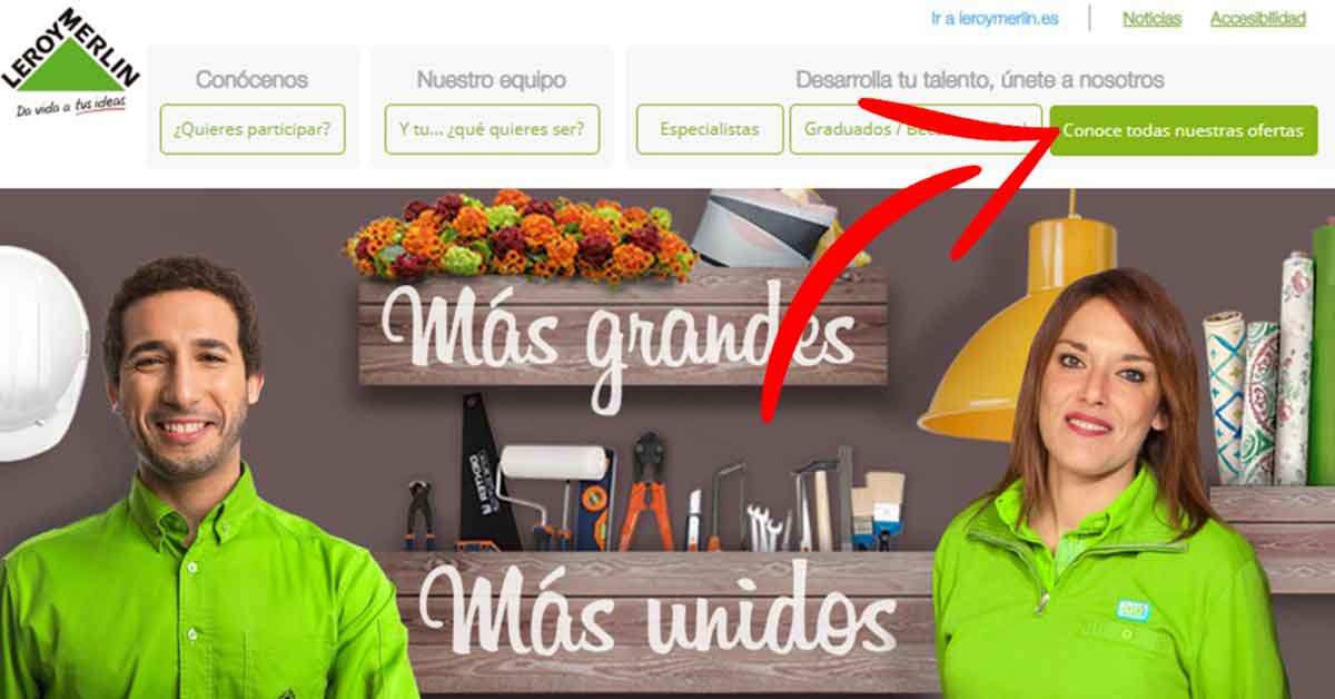 Una vez accedas al portal de empleo, hay varias opciones. Por ejemplo si seleccionas el botón ‘Quieres participar’, aparece una página en la que se desglosan todos los puestos de empleo que tiene Leroy Merlin así como las principales funciones de cada uno de ellos. Sin embargo, si quieres ir directamente a las ofertas de empleo tienes que seleccionar el botón verde que dice ‘Conoce todas nuestras ofertas’. Aquí aparece un listado directamente de todas las ofertas de empleo disponibles que tiene la empresa.