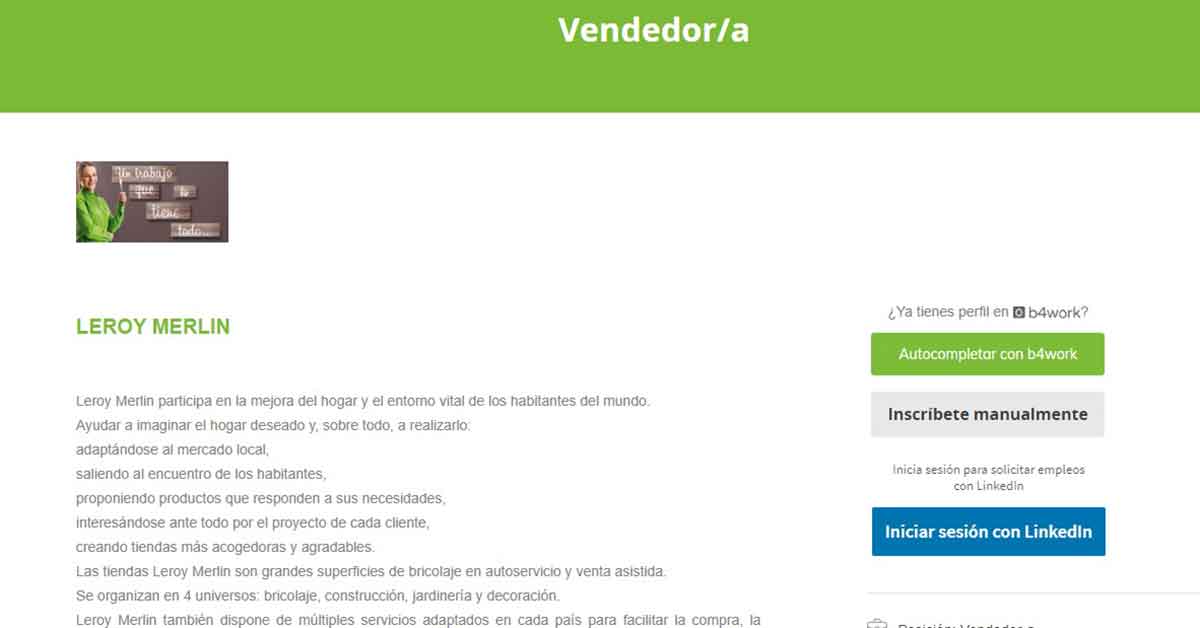 Para poder inscribirte en una oferta de empleo de Leroy Merlin tienes que ir al portal principal de empleo. Es posible acceder este portal a través de la siguiente dirección: Empleo en Leroy Merlin