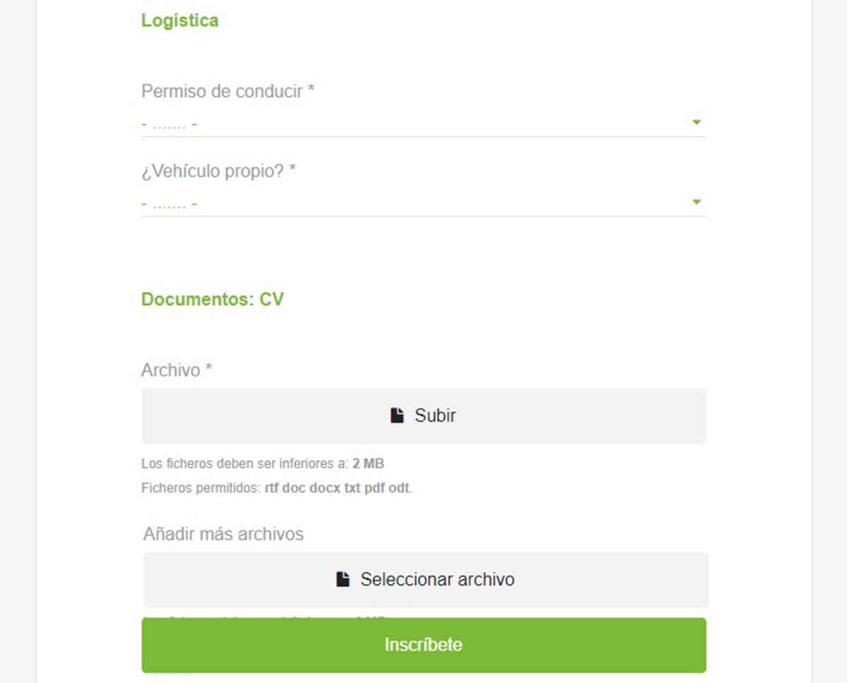 Por otra parte, si no encuentras ninguna oferta que te interese, puedes dejar tu currículum en la base de datos sin necesidad de inscribirte a una oferta. Lo tienes que hacer con el botón verde que dice ‘Deja tu CV’. Si localizas una oferta a la que te quieres inscribir, tienes que seleccionarla para acceder a todos los detalles.