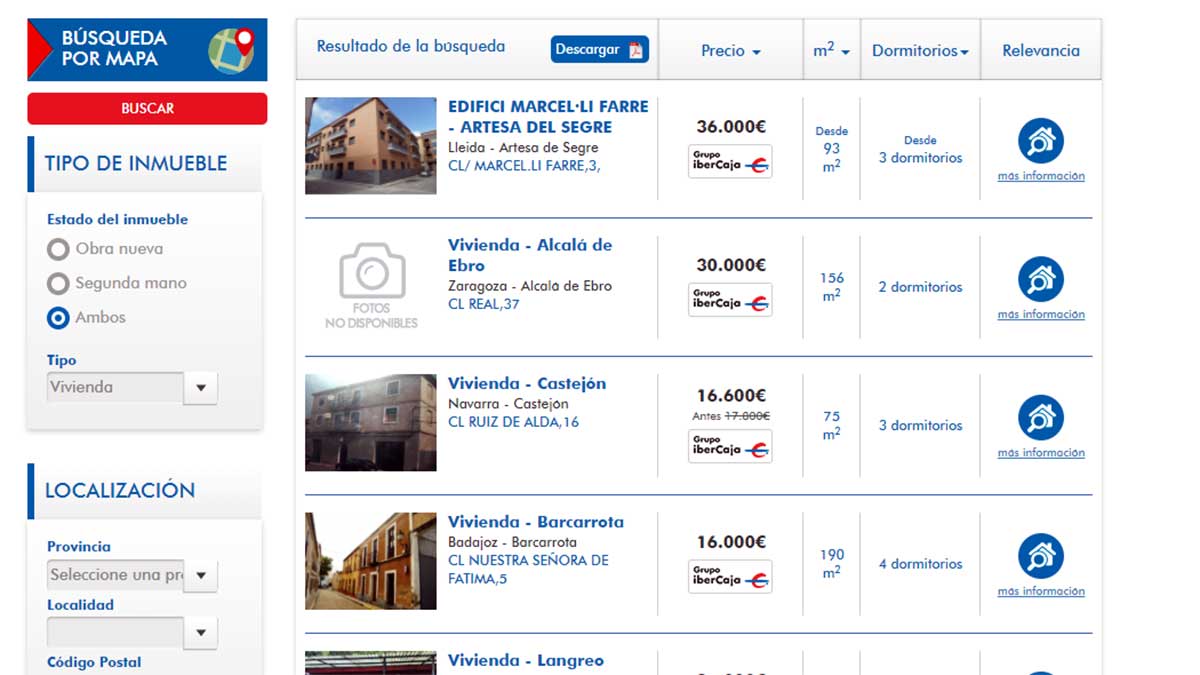 El portal inmobiliario de Ibercaja tiene un total de 63 pisos a la venta distribuidos por toda España y en una amplia horquilla de precios. Los más económicos están a la venta por menos de 20.000 euros. En su mayoría esta entidad dispone de pisos en venta, pero también hay casas de pueblo con más terreno, superando los 100 y 200 metros cuadrados de superficie.