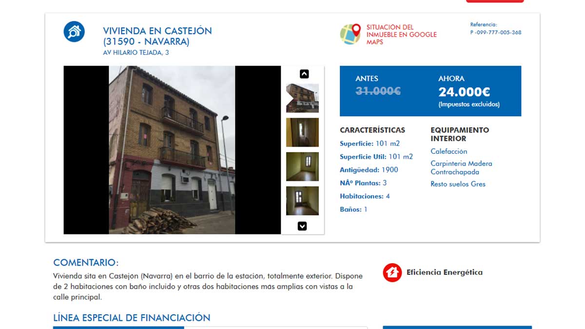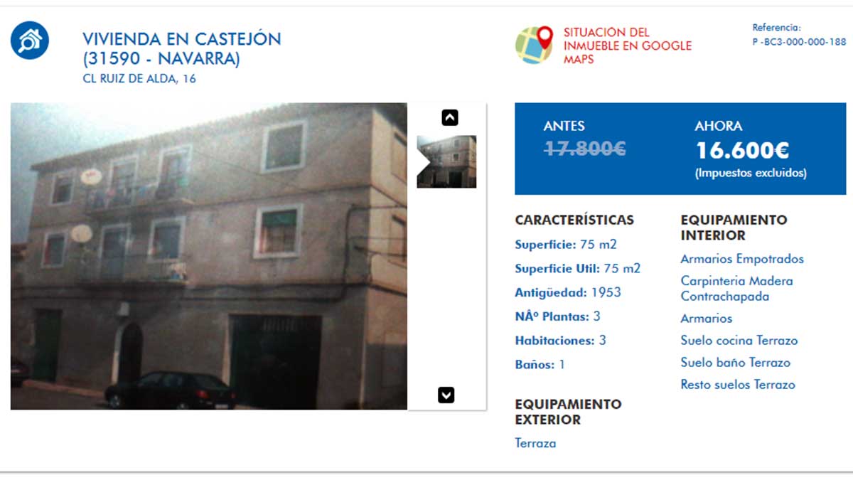 Otro ejemplo por este precio destaca en Castejón, Navarra. En esta localidad el banco cuenta con un piso de 75 metros cuadrados y tres dormitorios. El precio de venta es 16.000 euros.