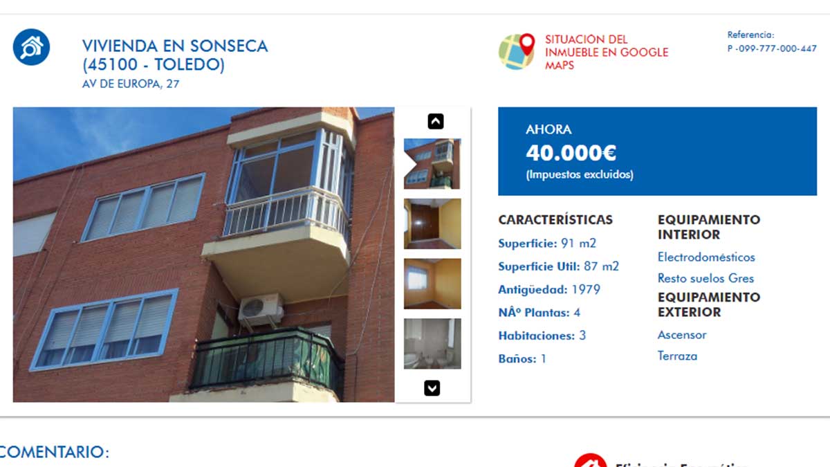 Un último ejemplo lo encontramos en Sonseca, localidad perteneciente a Toledo. Hay un piso a la venta de 91 metros cuadrados y 3 dormitorios que se vende por 40.000 euros.