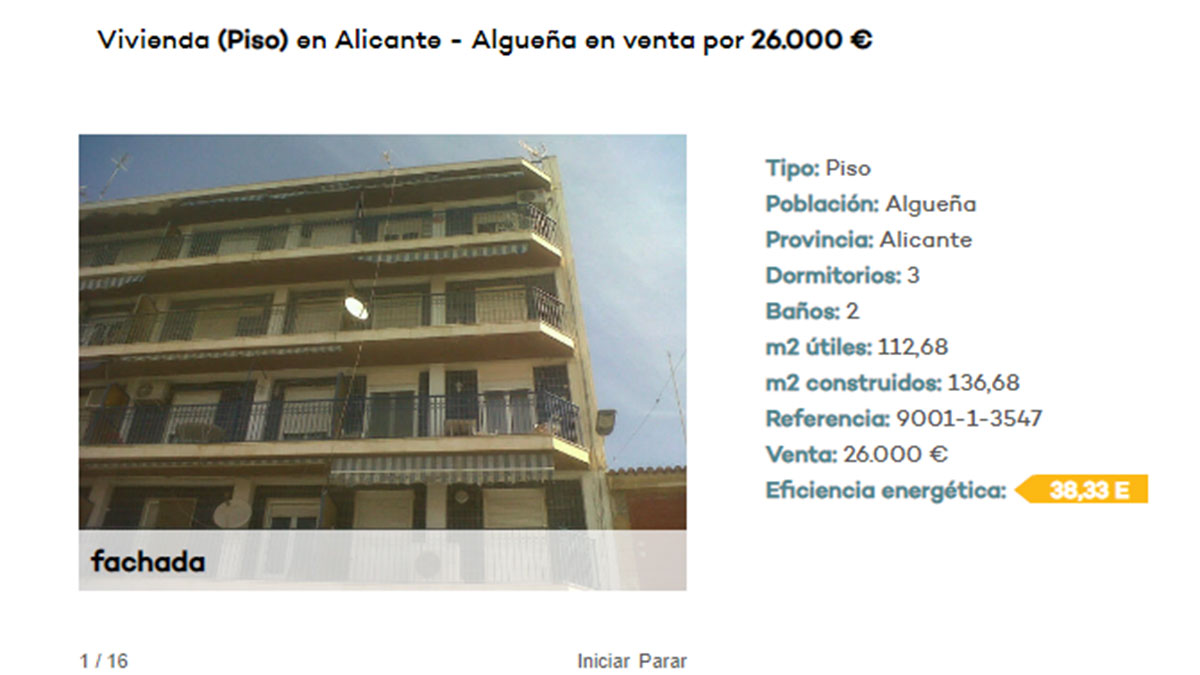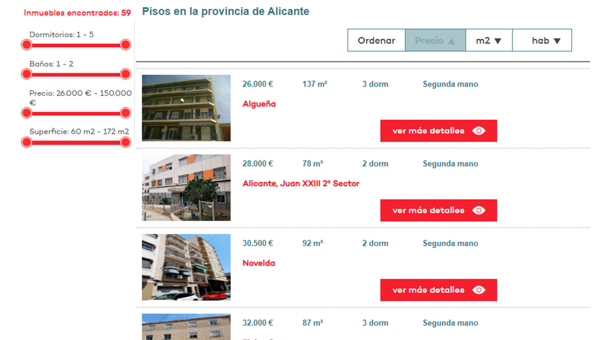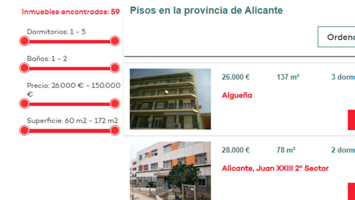 Por ello, seleccionamos una provincia. Para este ejemplo vamos a ver el catálogo de pisos de bancos en Alicante, una de las localidades en las que hay una mayor oferta de inmuebles de este portal. Al indicar una provincia, se abre una nueva página donde aparece el catálogo de pisos disponibles.